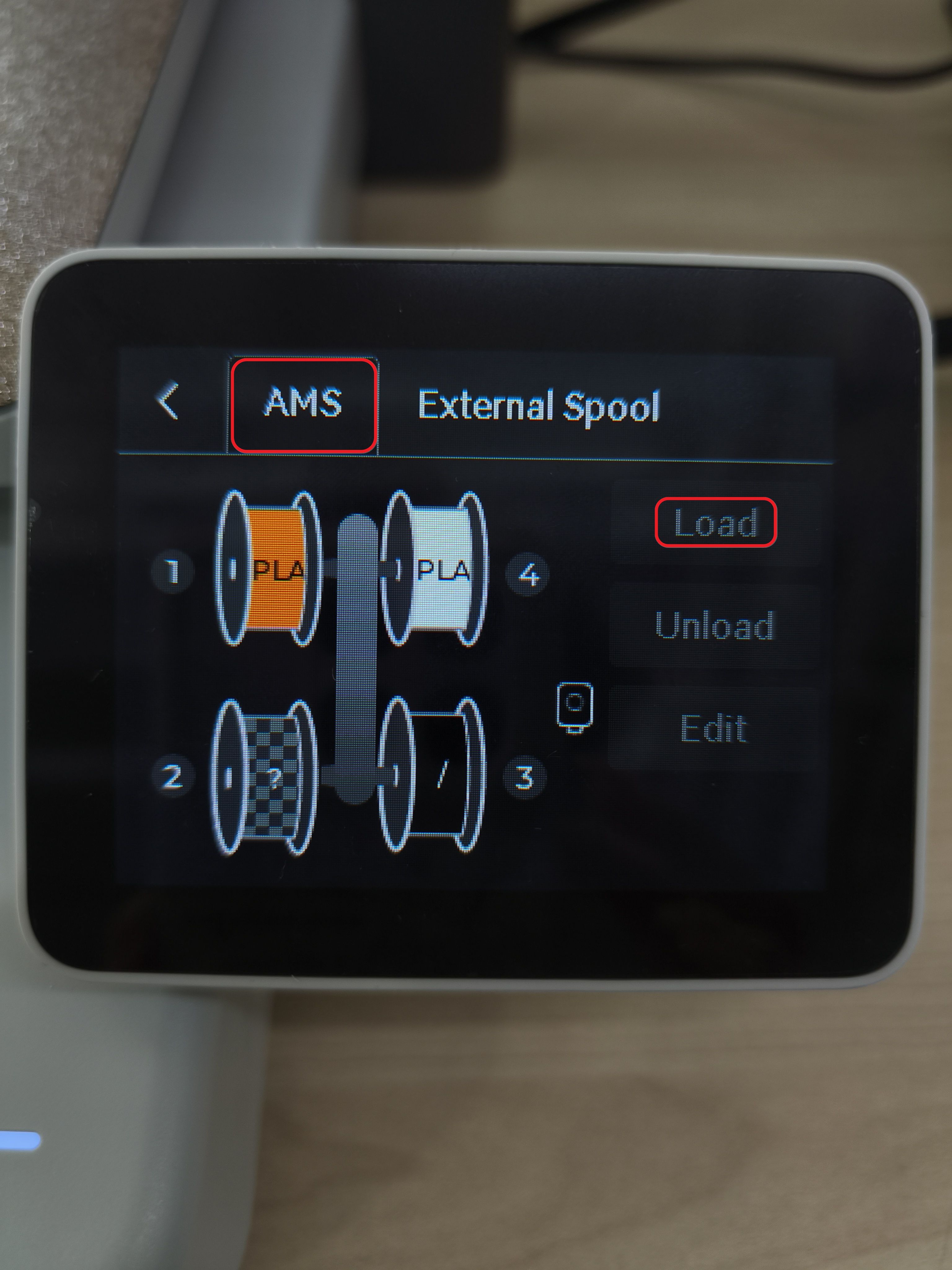 On the display screen, press "filament", it will display the AMS control panel. Press "Load" to run the filament loading process, if the process is completed without any error, the AMS connection board replacement is complete and successful.