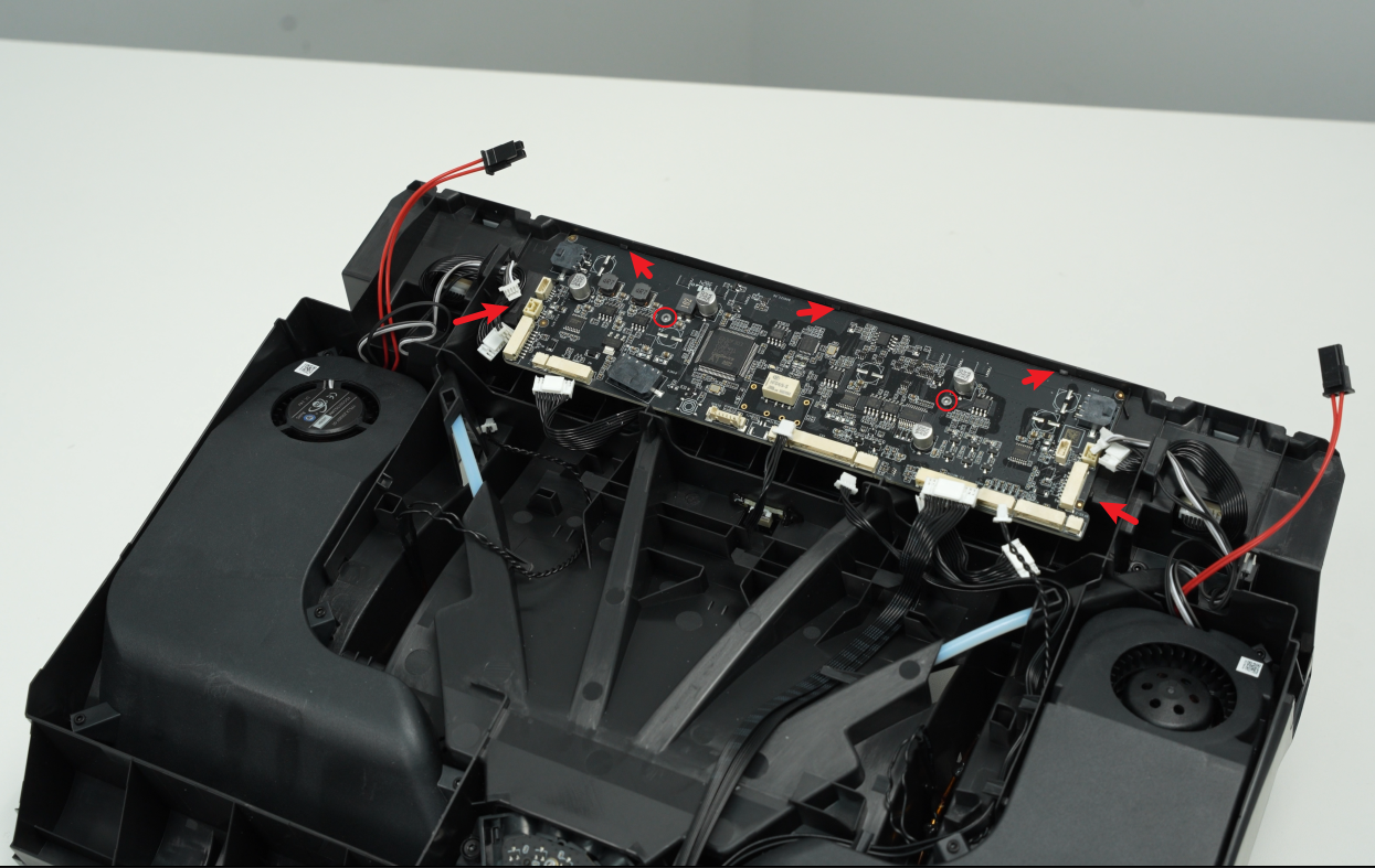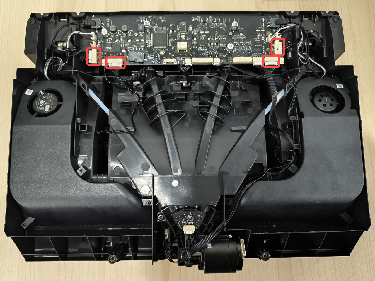 Find the connectors for power supply cable and signal cable (red box area) on the main board and disconnect them.