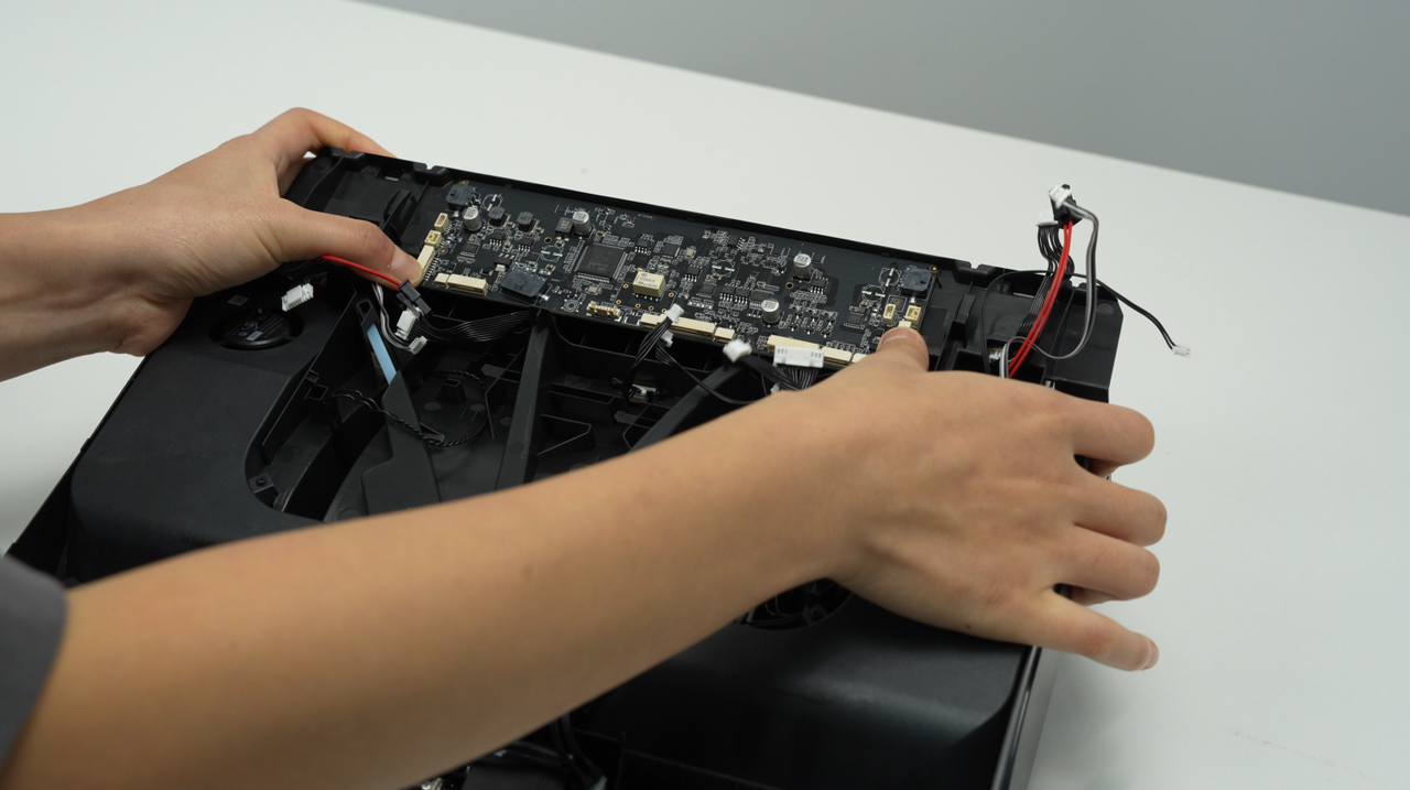 Connect 18 cables according to the marks or photos before disconnection. After confirming that the mainboard is installed and pressed by 5 clips, lock 2 screws.