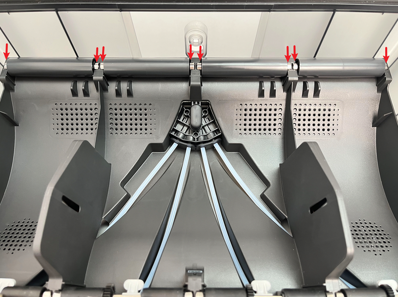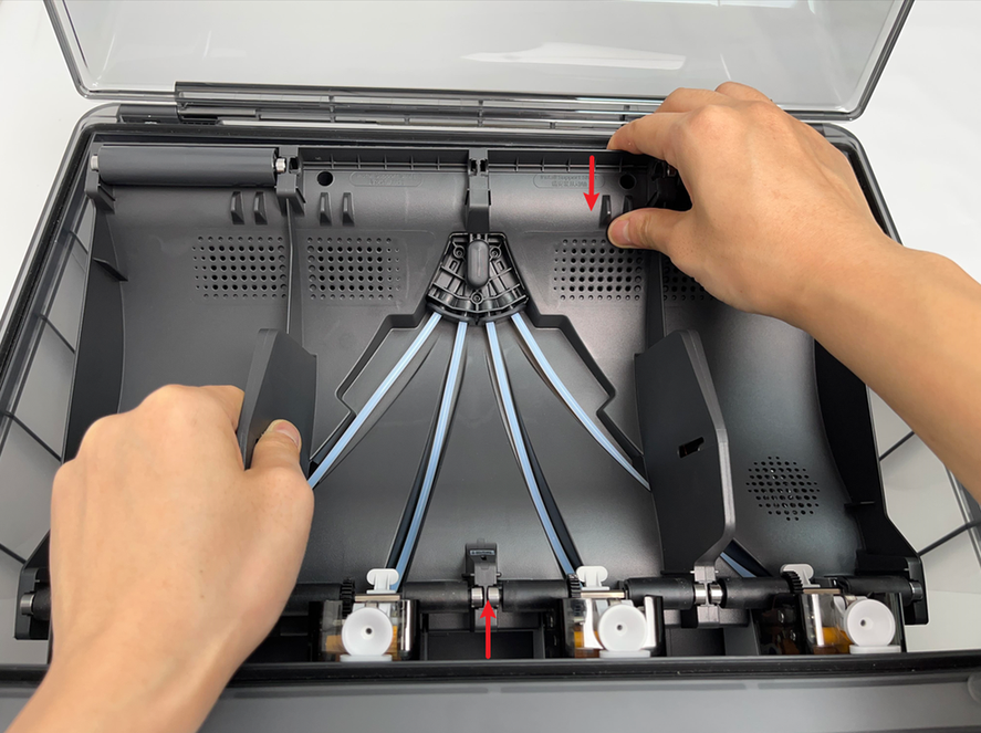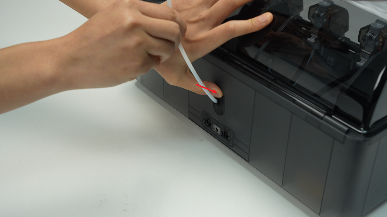 Press the PTFE tube release button back into the housing in the following direction, insert the buckle into the corresponding slot smoothly, and keep the black silicone housing embedded flat.