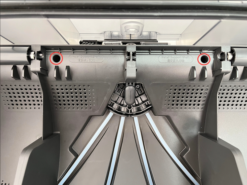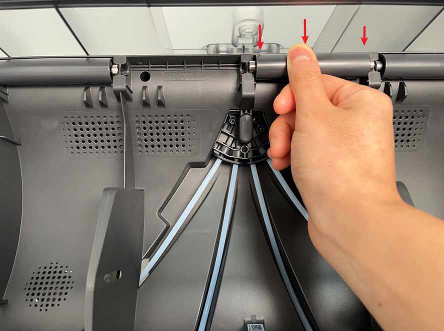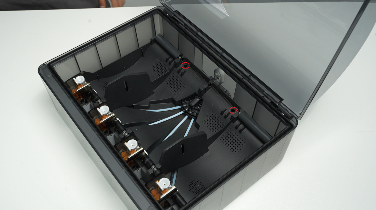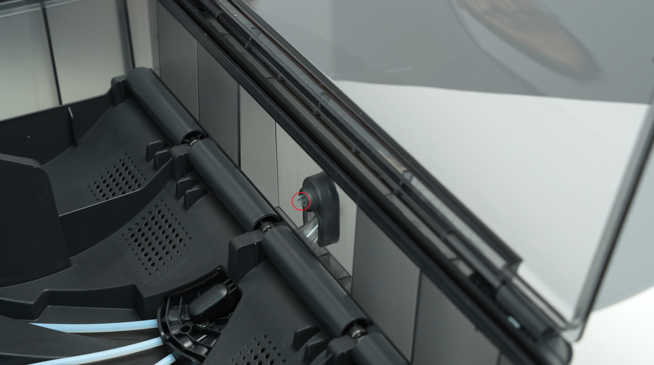 Pinch the clip from the inside of the lower cover to automatically pop open the PTFE tube release button, and then pull out the PTFE tube release button from the back of the AMS 2 Pro.