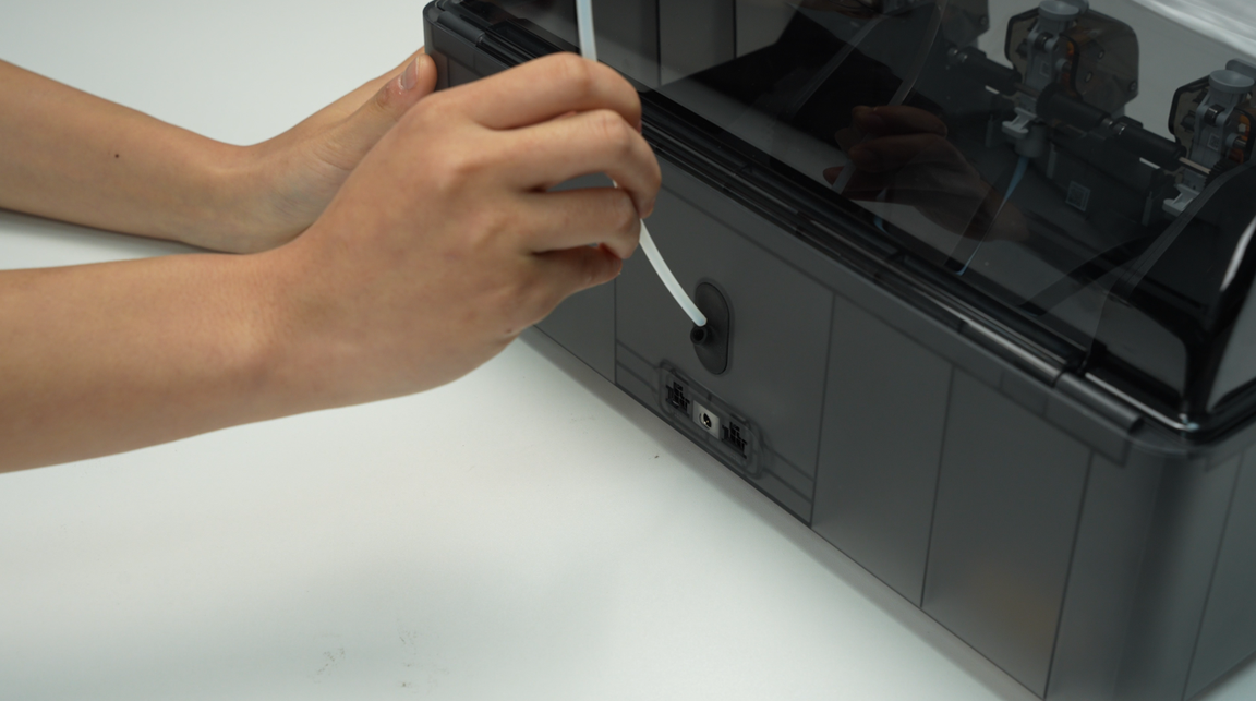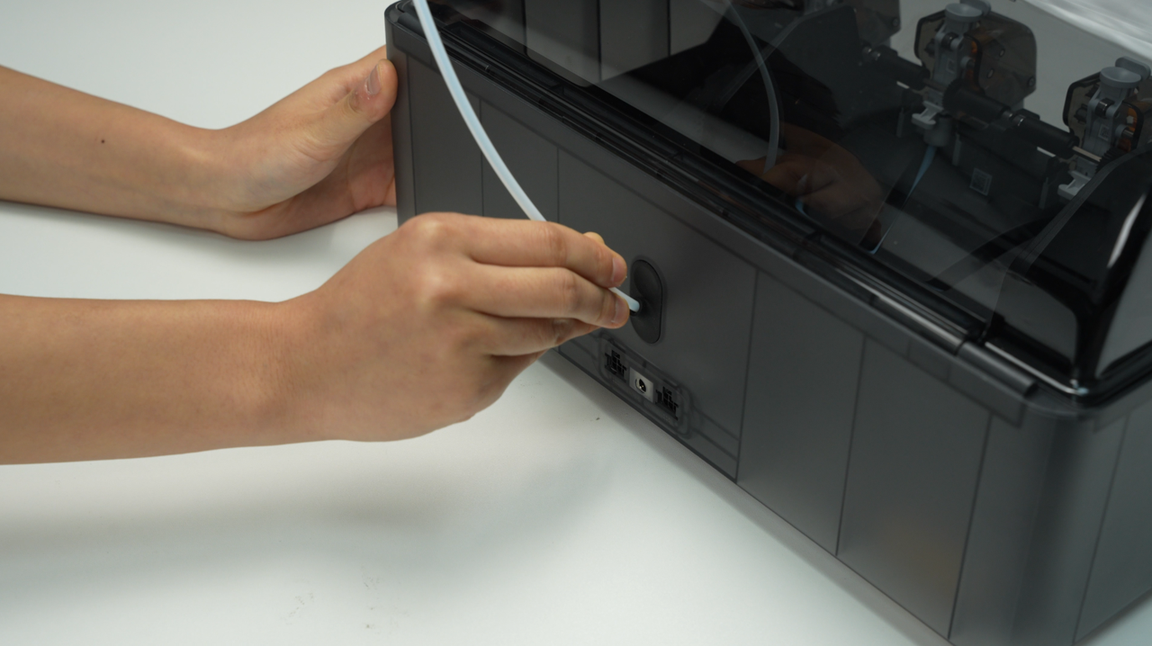 Check to make sure that the PTFE tube silicone bracket is aligned with the filament hole of the filament hub unit, and push the PTFE tube from the rear of the AMS 2 Pro. After installation, pull the PTFE tube to confirm that the PTFE tube is fixed.