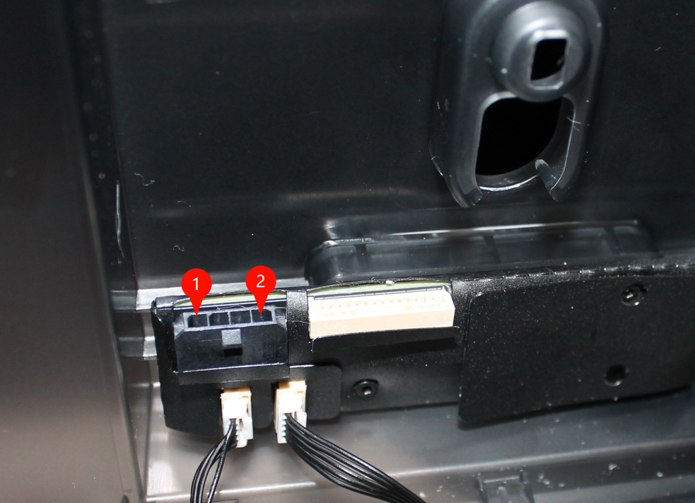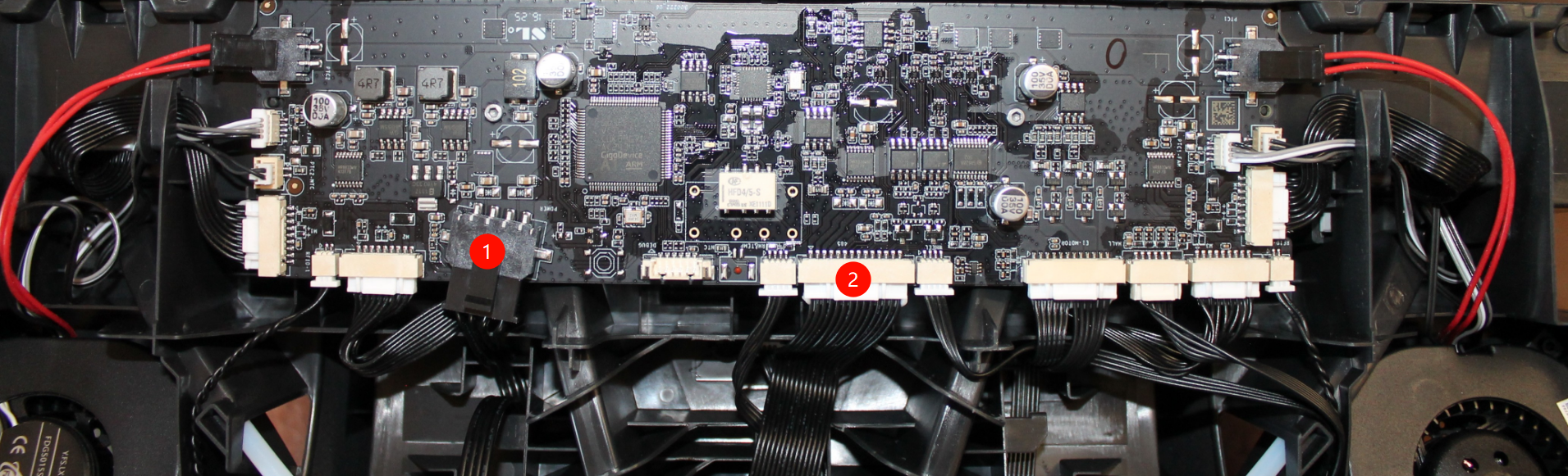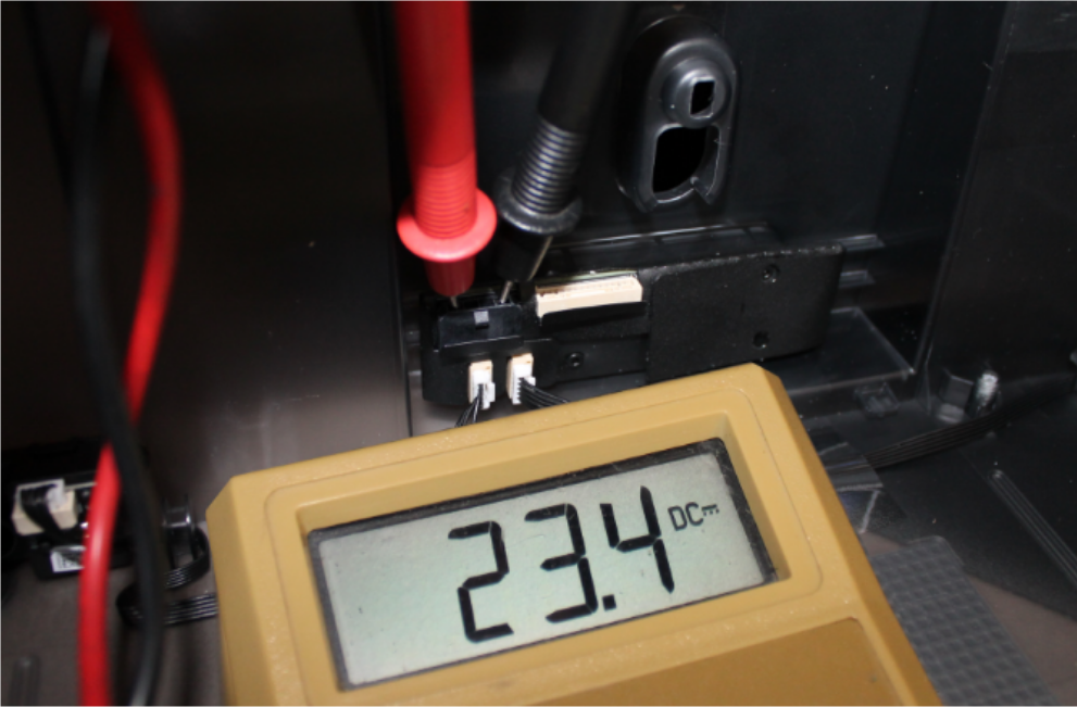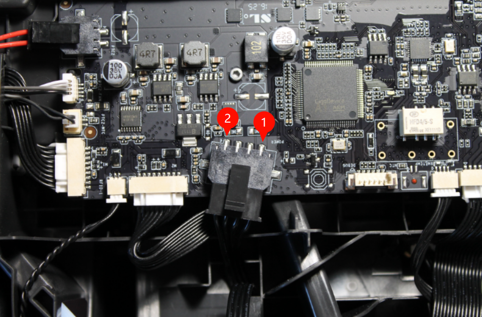 Once you have access to the power board, disconnect the top connectors. Using the positive (red) probe, touch the pin marked (1), and using the GND (black) probe, touch the pin marked (2). The multimeter should read 24V, as illustrated in the image below.