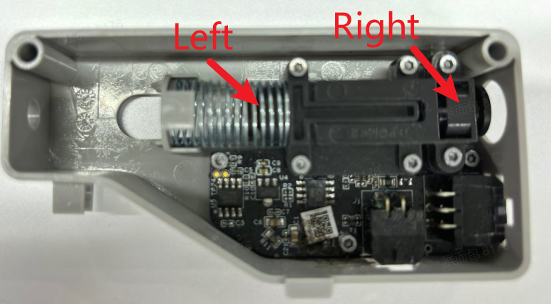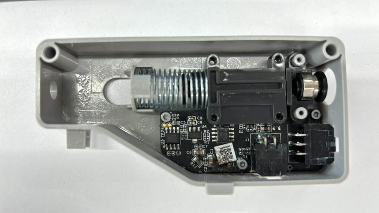 Install the board assembly into the housing, confirm that the spring is installed in place, and then connect the PTFE tube on the right side.