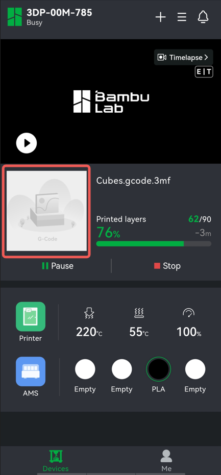 Since the Skip object feature requires selecting an object to skip on the thumbnail of the print job, you cannot use the Skip object feature if the print job does not have a thumbnail (as shown below). Thumbnails of print jobs cannot be obtained in the following cases: