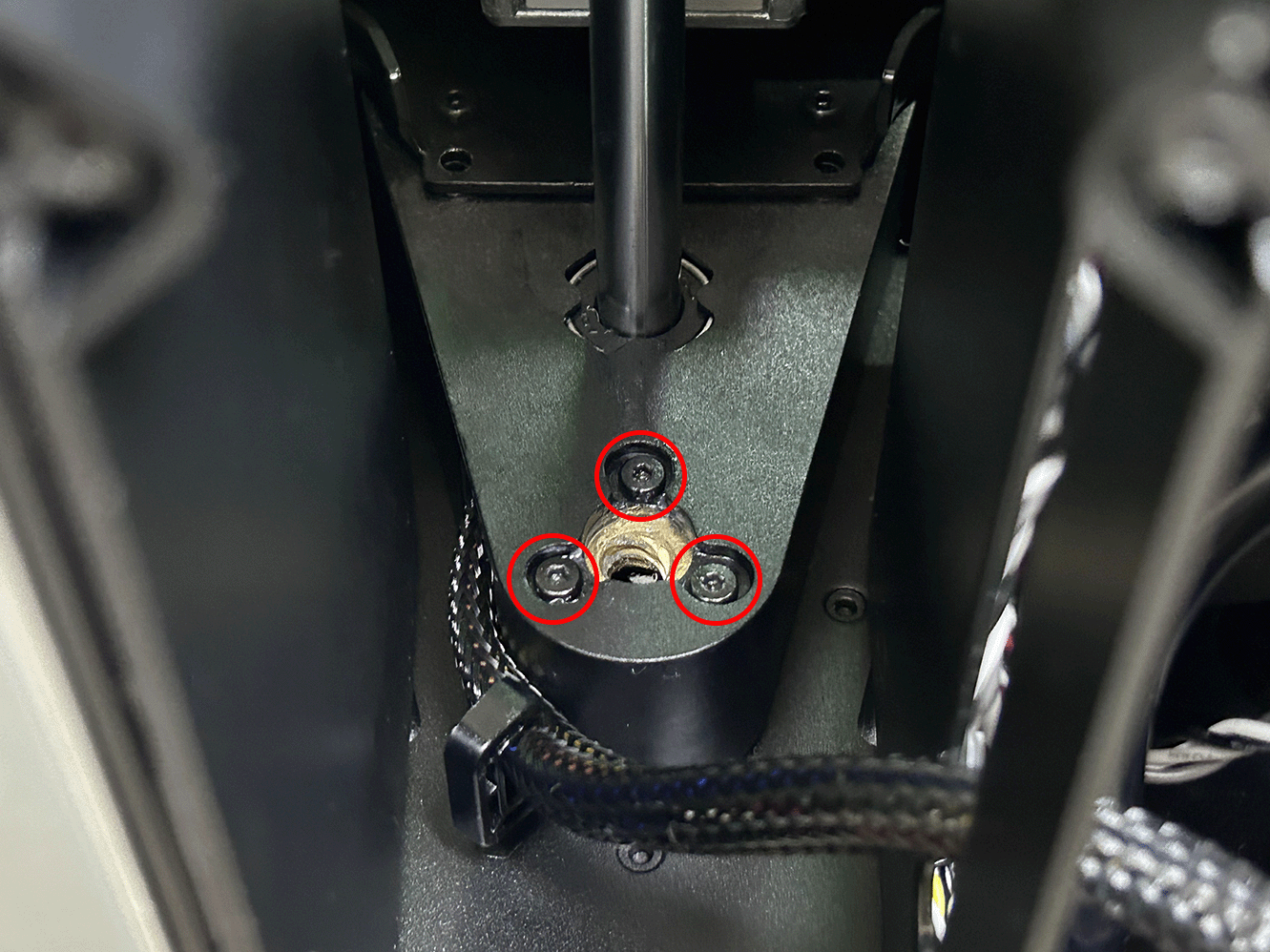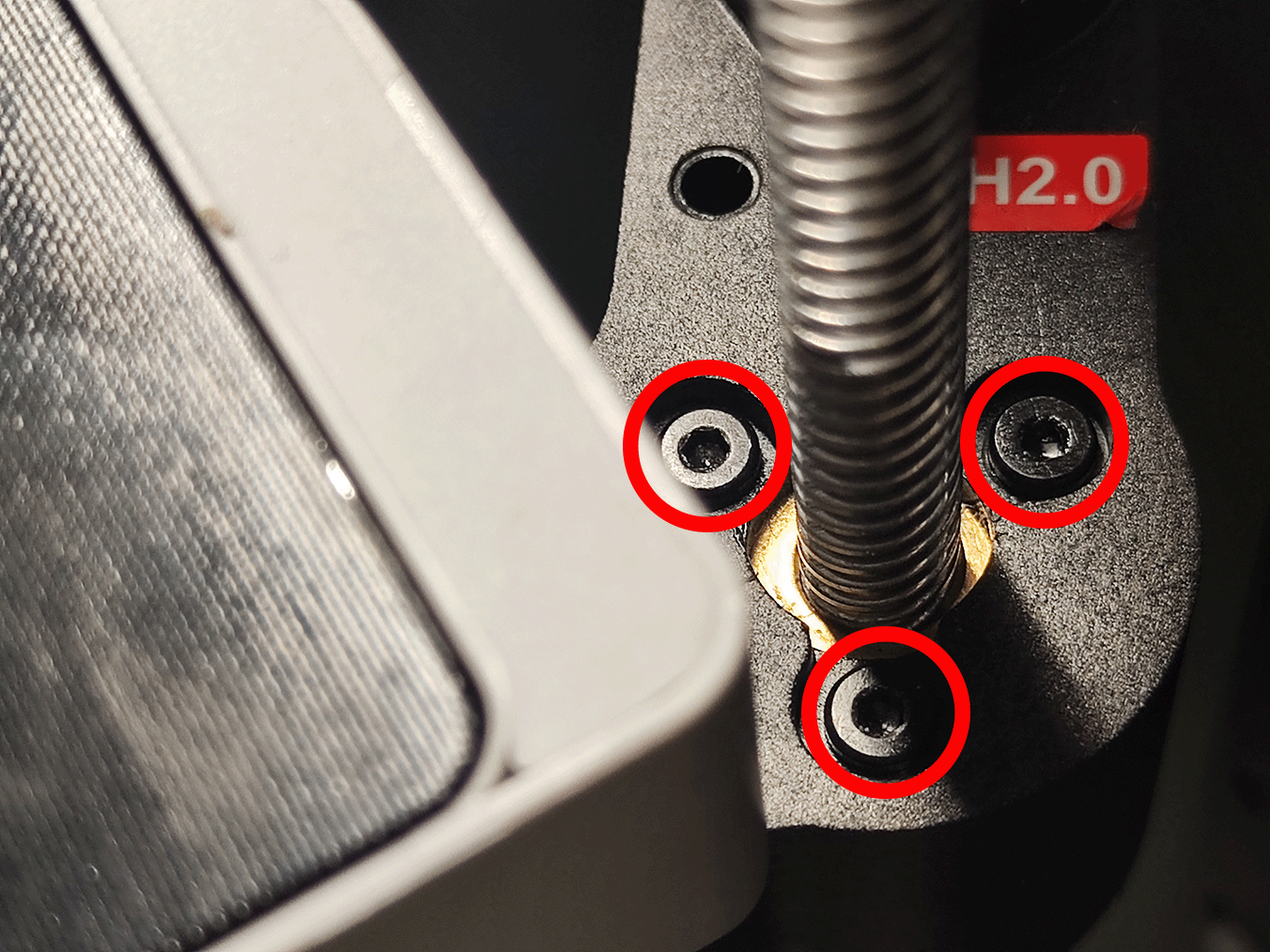 If you replaced the lead-screw nut, again verify the lead-screw nut’s bore is perfectly concentric with the bed passthrough hole. Once aligned, tighten the three nut-fixing screws in sequence.(red circles)
