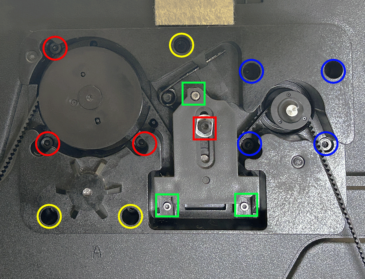 Rrefer to H2D Z Belt/Z Belt Timing Pulley/Z-Axis Tensioner, and and install the three tensioners (green boxes) and the one Z-tensioner slider screw (red box).