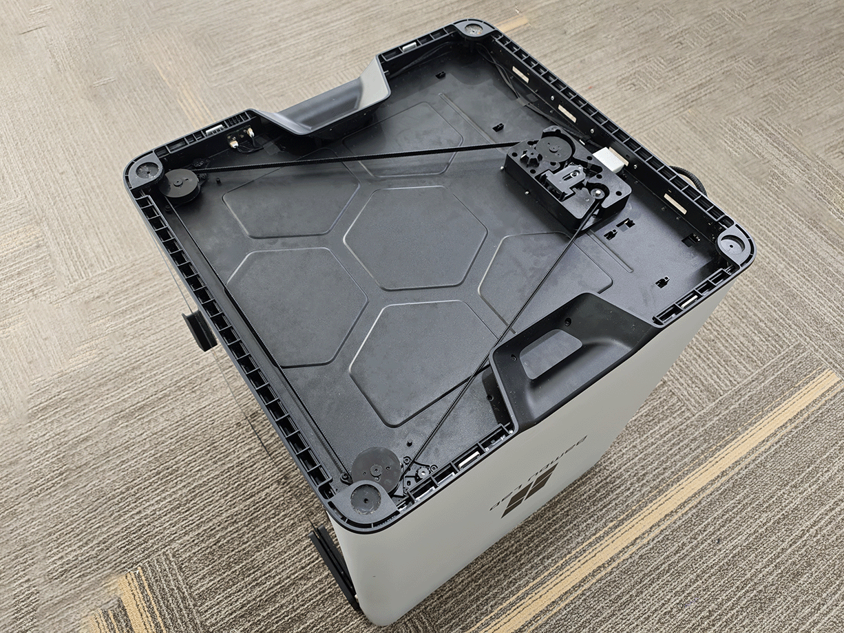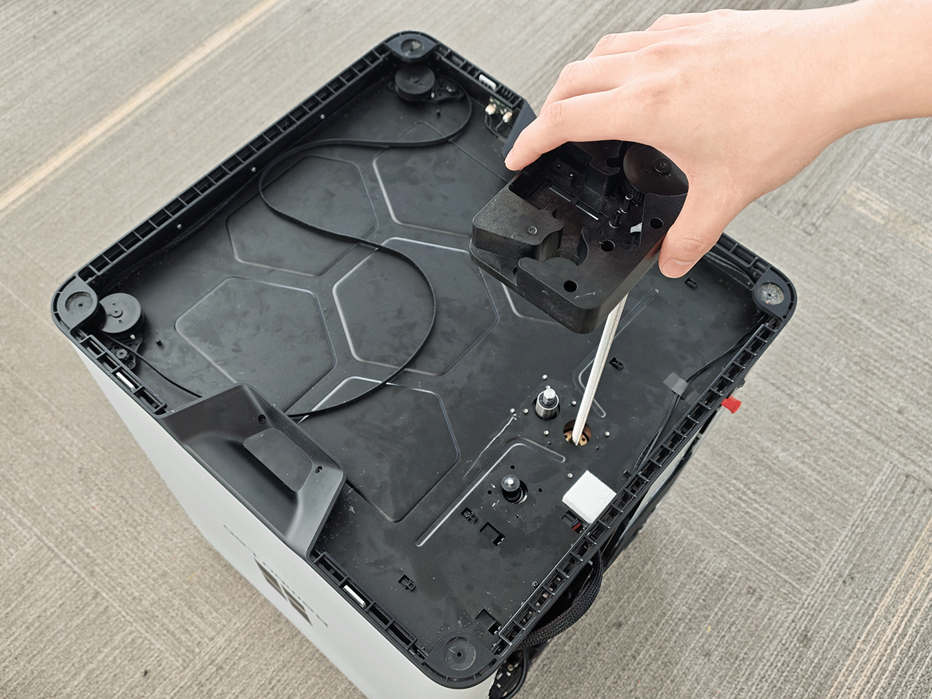 To remove the enclosure plastic bottom ring, please pull that the handle area to partially slide it out,then pull at the left/right footpad areas to fully extract it. For more detail, you can see Replace H2D Enclosure Plastic Bottom Ring。