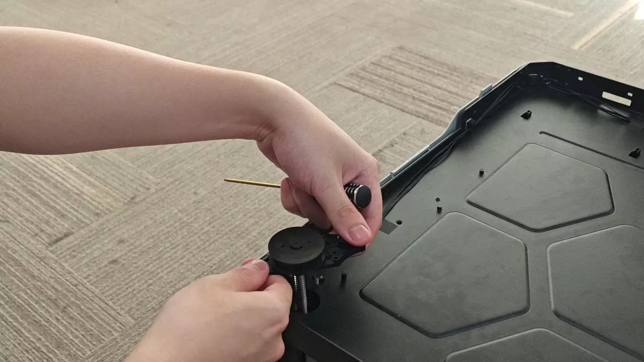 From the bottom of the printer, feed the lead screw from top to bottom through the bottom opening. Gently adjust the lead-screw angle to line it up with the heatbed’s pre-installed nut. (There’s no self-locking—gravity will naturally draw the screw down.)