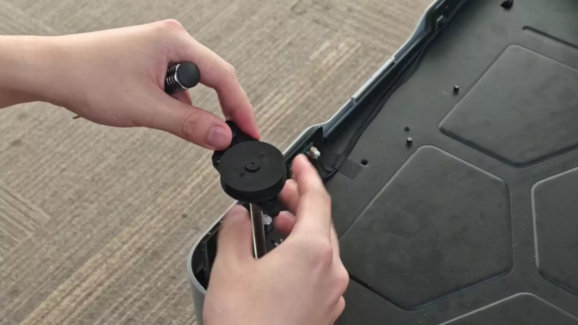 Feed the lead screw downward through the reserved opening at the bottom of the printer. Slowly adjust the angle to align it with the through-hole of the pre-installed nut on the heatbed. Once aligned, thread it in slowly until you feel noticeable resistance and the locating face just makes light contact; stop applying force.