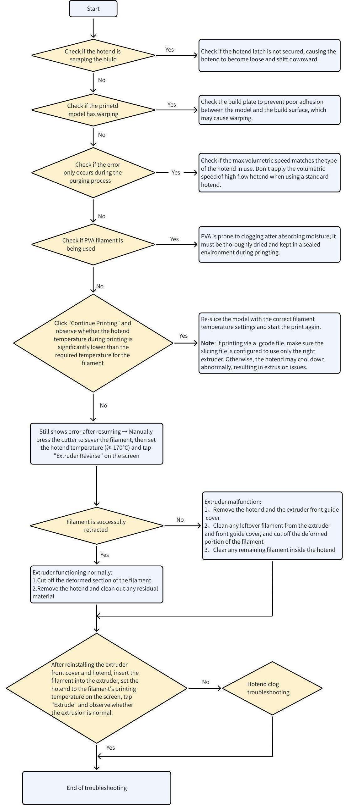 During printing, the toolhead extruder motor continuously monitors extrusion force. If abnormal extrusion force is detected, an error will be triggered and the print job will pause. The user must resolve the issue before printing can continue.