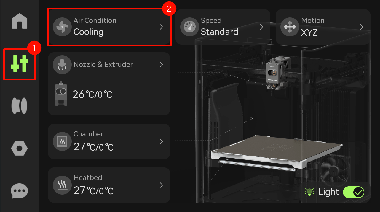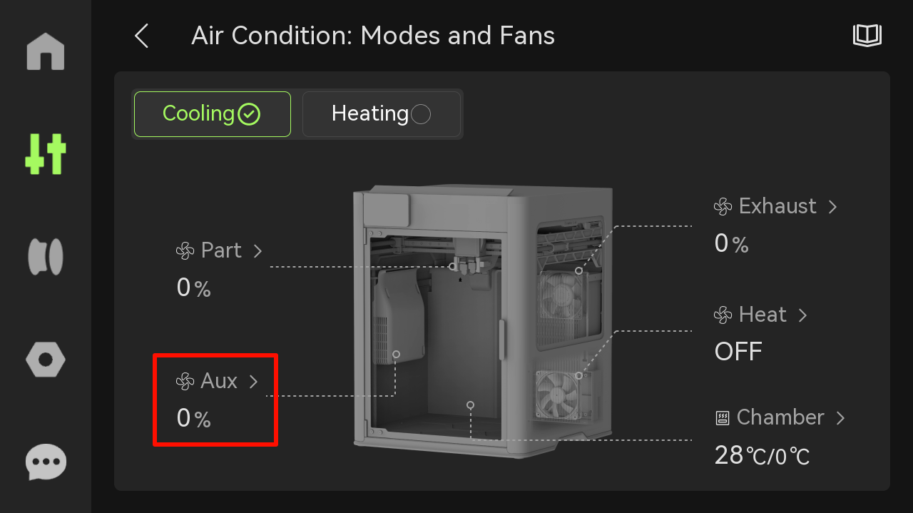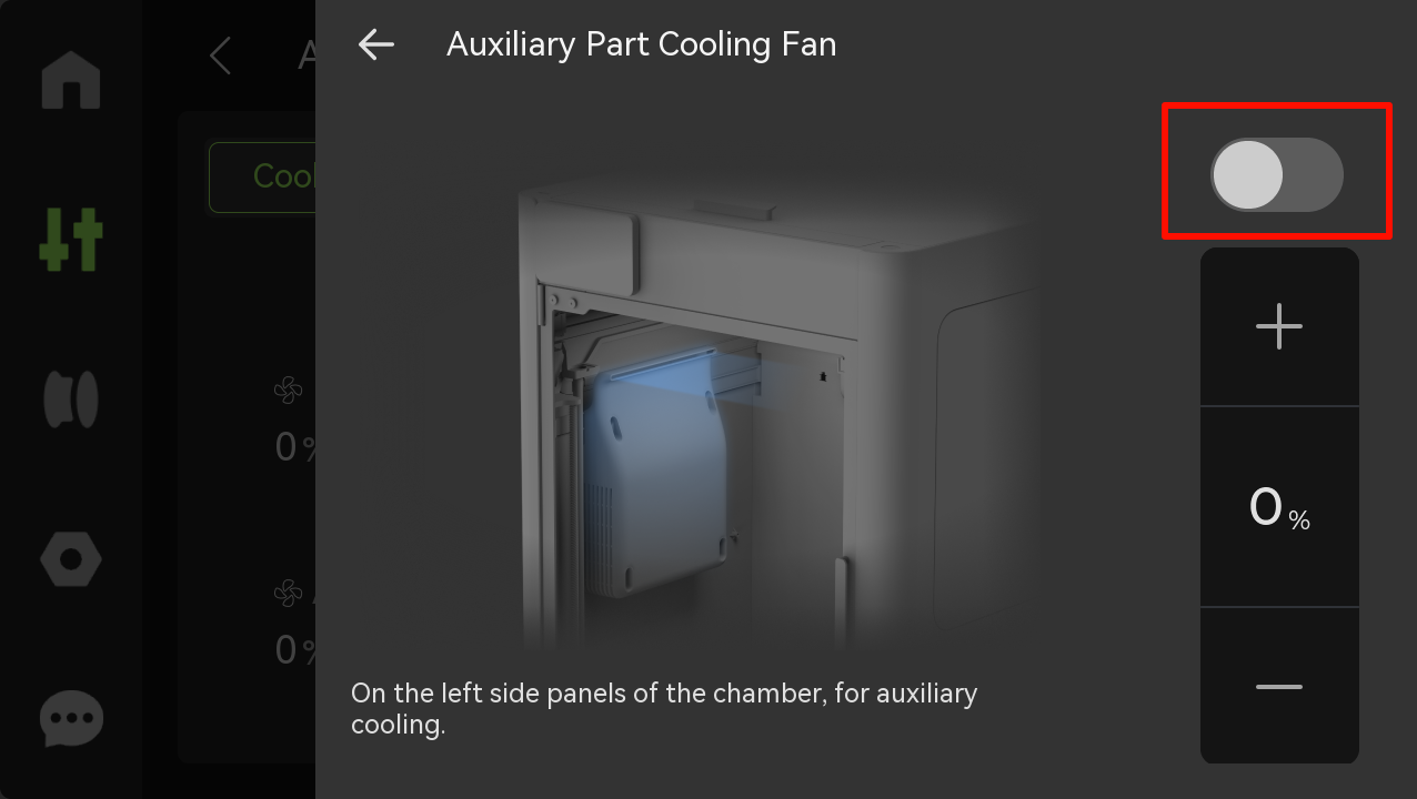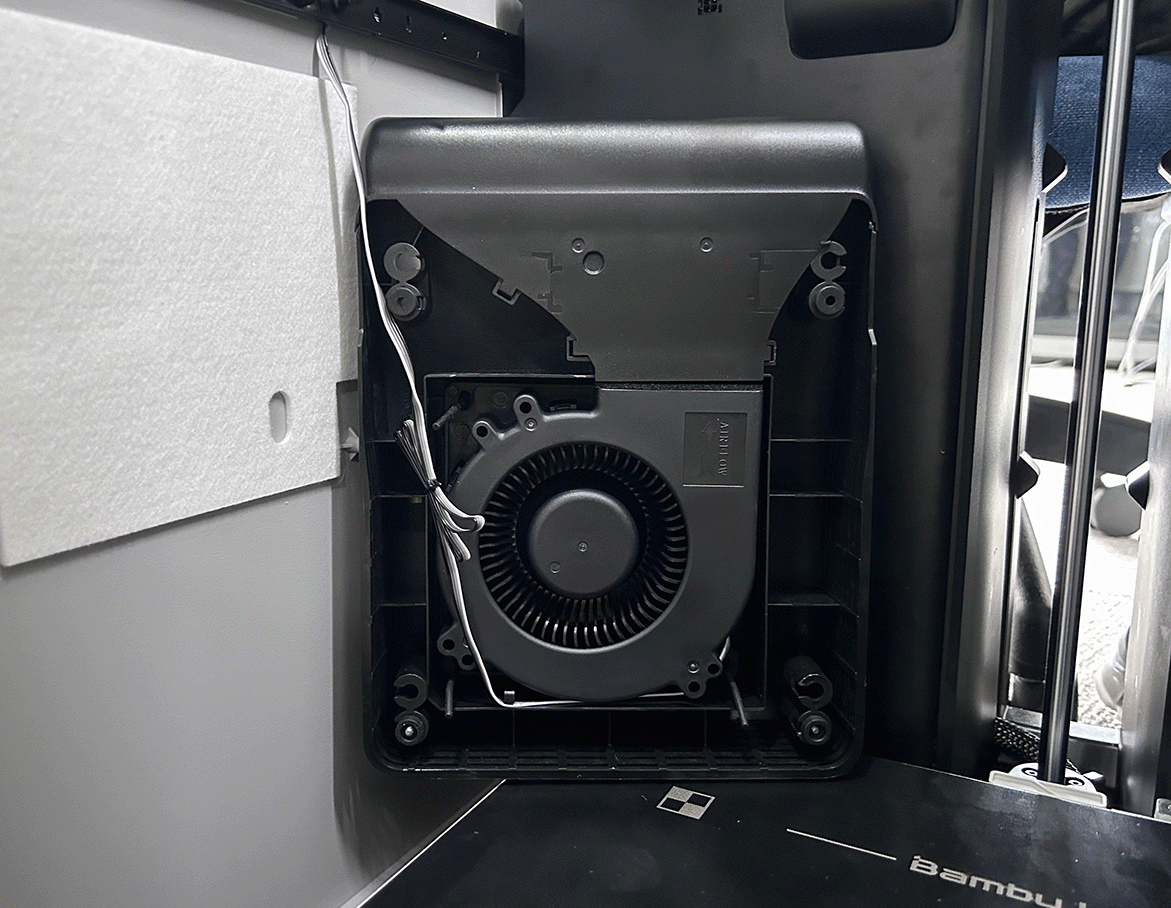 The auxiliary part cooling fan is installed on the left side of the printer chamber, providing better cooling conditions for high-speed printing.
