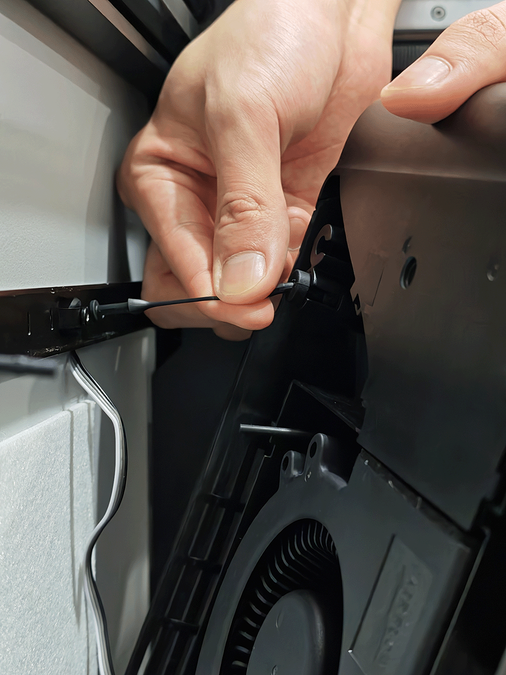 Use an H2.0 hex driver to remove the four door screws (M3×3, 10 mm nut diameter), two at the top and two at the bottom. Support the glass with one hand and lift the door away.