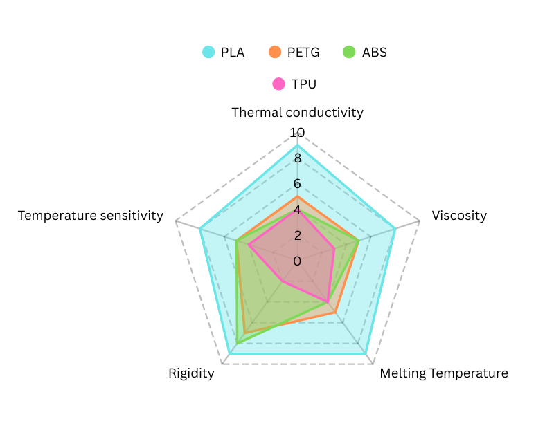 Mechanical properties affect extrusion even before melting. Rigid filaments like PLA and ABS push smoothly through the extruder at high speeds, but TPU’s flexibility causes it to compress and buckle when forced quickly, making its maximum volumetric speed the lowest of all. PETG also tends to stick to nozzle walls when molten, adding drag that further slows flow.