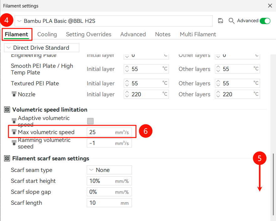 Then, ensure you are in the filament tab (4) and scroll down (5) until you find the Max volumetric speed (6).