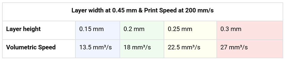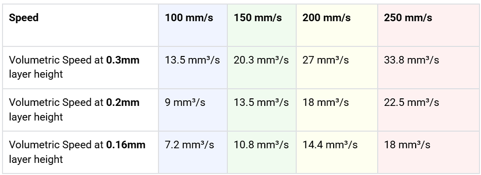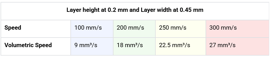 Volumetric Speed (mm³/s) = Layer height (mm) X Layer width (mm) X Print speed (mm/s)