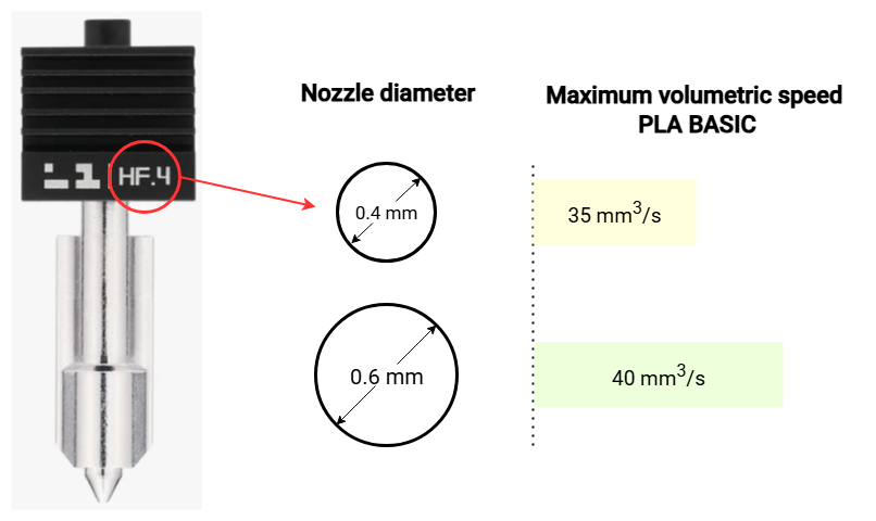 In practical terms, switching from a 0.4 mm nozzle to a 0.6 mm High Flow nozzle increases the maximum volumetric speed that the system can achieve without under-extrusion. For example, the Bambu Lab H2 Series with a 0.4 mm High Flow nozzle can reach around 35 mm³/s with PLA Basic. By moving to a 0.6 mm High Flow nozzle, the system can extrude even up to 40 mm³/s, which enables faster printing and larger headroom for Speed mode changes.