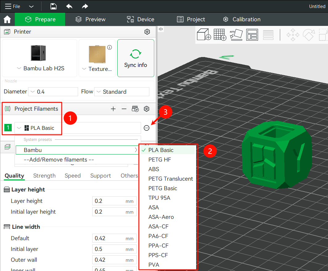 Now we must compare the actual volumetric speed against the maximum volumetric speed for each application. There is no need for complex experiments with different filaments, nozzles or temperatures, all you need to do is navigate to the Bambu Studio filament section (1), then select your desired material (2) and click to edit the preset (3).