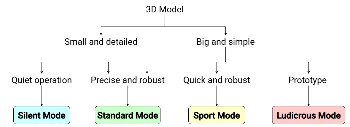 Sport Mode is designed for situations where faster print times are desired, but part quality and function still matter. It is particularly useful for utility parts, prototypes, or models where surface finish is not critical, yet the part must remain mechanically sound. Sport Mode increases print speed while staying within safe limits for extrusion and cooling, making it a good option when you want to save time but still need functional reliability.