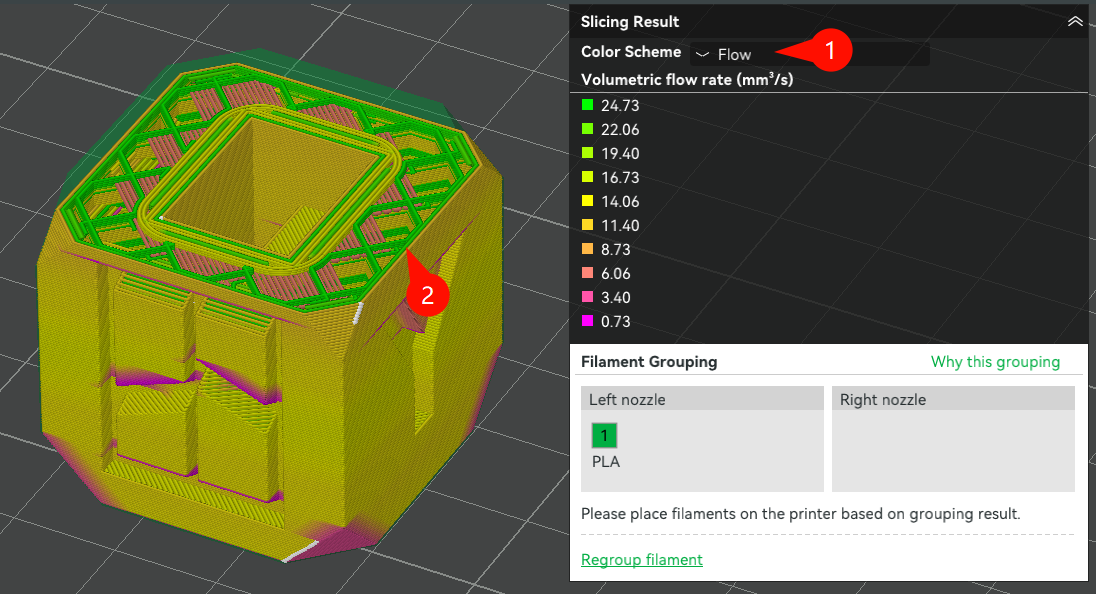 TIP: After slicing a model, if your print seems slower than expected, check the Maximum Volumetric Speed setting in Bambu Studio, under the "Flow" menu (1). It may limit speed for quality reasons, and you can see exactly where the maximum volumetric speed is achieved.