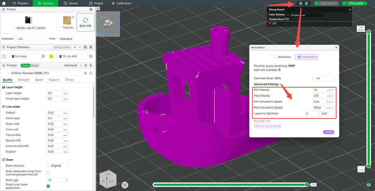 Once finished, you can review the optimization results in the sliced model and send it directly to the printer to start printing.
