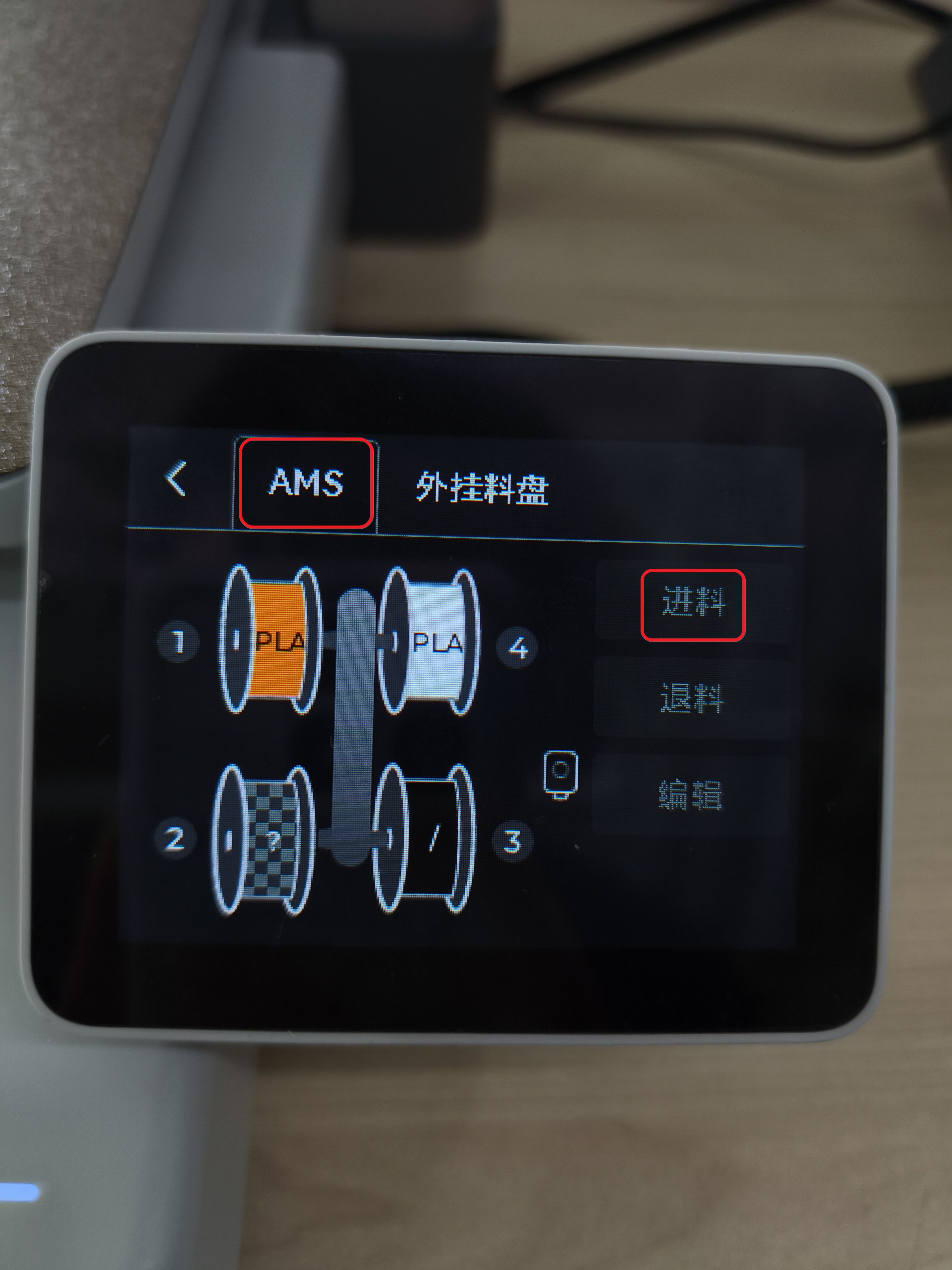 在显示屏上,点击“耗材”,如下所示,屏幕将显示 AMS 控制面板。按下“进料”按钮开始进料,如果该过程没有任何错误地完成,AMS 接口板更换完成并成功。